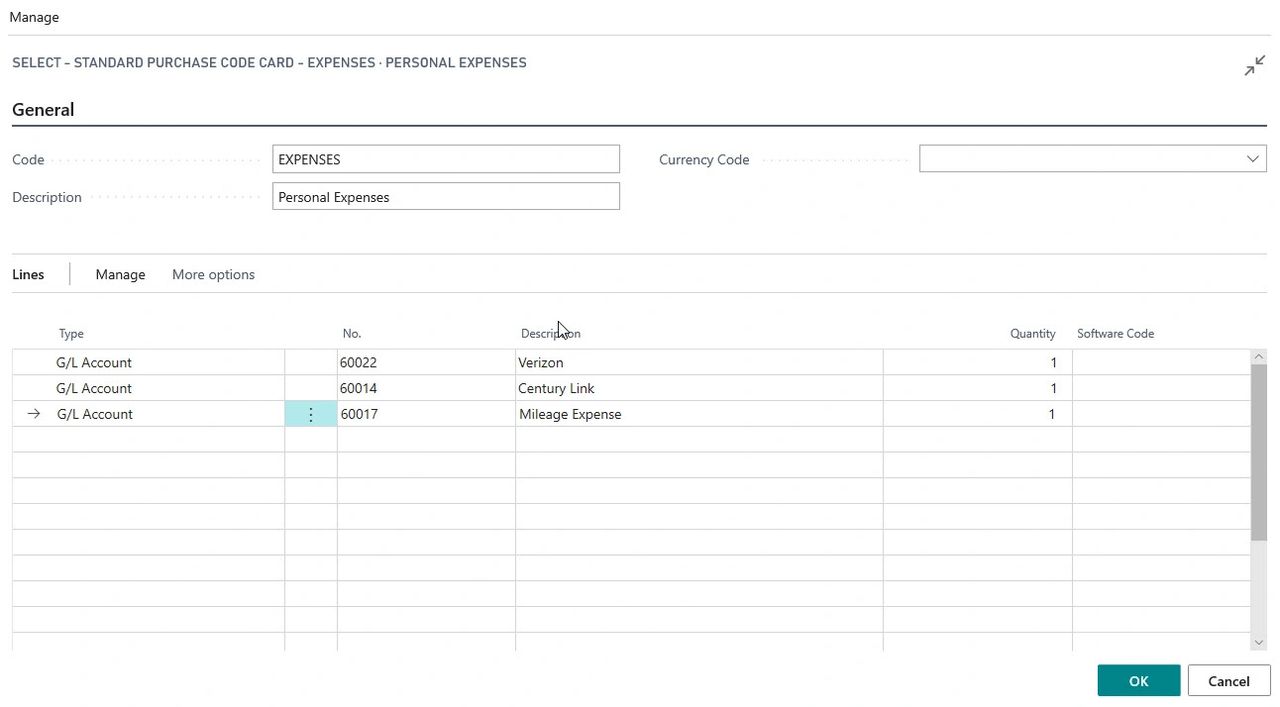 Below is the completed standard purchase code card for expenses. The amounts of two of the three lines have been added which will pull through on the purchase invoice shown later on.